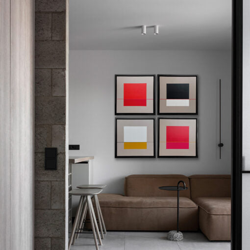 SET DE 4 PIEZAS DE ARTE FIGURATIVO PINTADO 100% A MANO EN TÉCNICA MIXTA SOBRE BASTIDOR DE MADERA CON APLICACIÓN DE ACRÍLICOS. MARCO DE MADERA NEGRO.